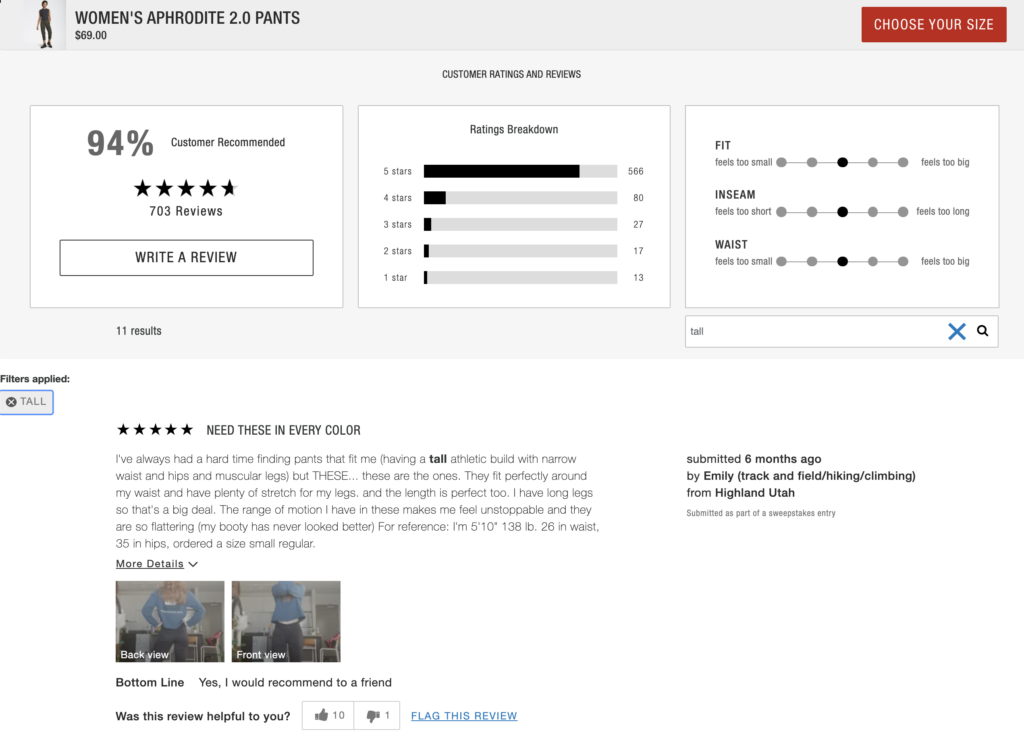 She’s tall, and she wants to know how a particular pair of pants have worked for others of similar height. So she types “tall” into the search box and finds reviews that specifically address this.