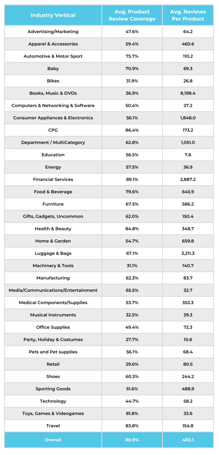 - Overall review coverage across verticals is 80.9%, with 402.1 reviews per product, on average.