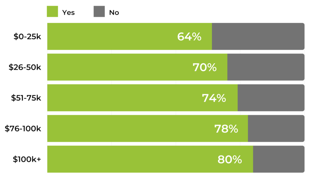 Finally, the higher the income, the more likely a consumer is to shop for groceries online. 80% of those who make over $100,000 have shopped online for groceries, compared to 64% of those who make $0-$25,000. This makes sense, as many grocery services charge a premium for online shopping.