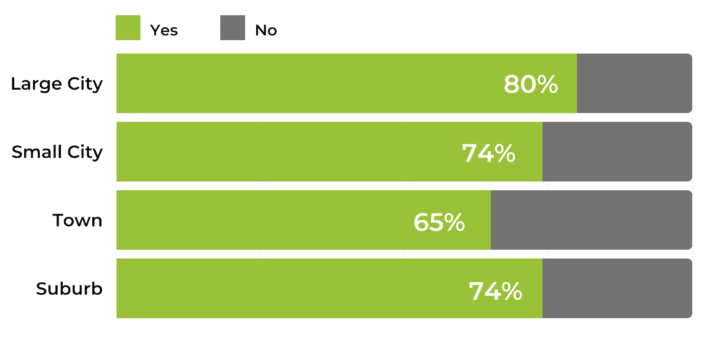 In addition, geographical location impacts a consumer’s likelihood of purchasing groceries online. 80% of city dwellers purchase groceries online, compared to 65% of consumers living in a town with a population less than 50,000 — which makes sense given there are more options for those living in larger cities.