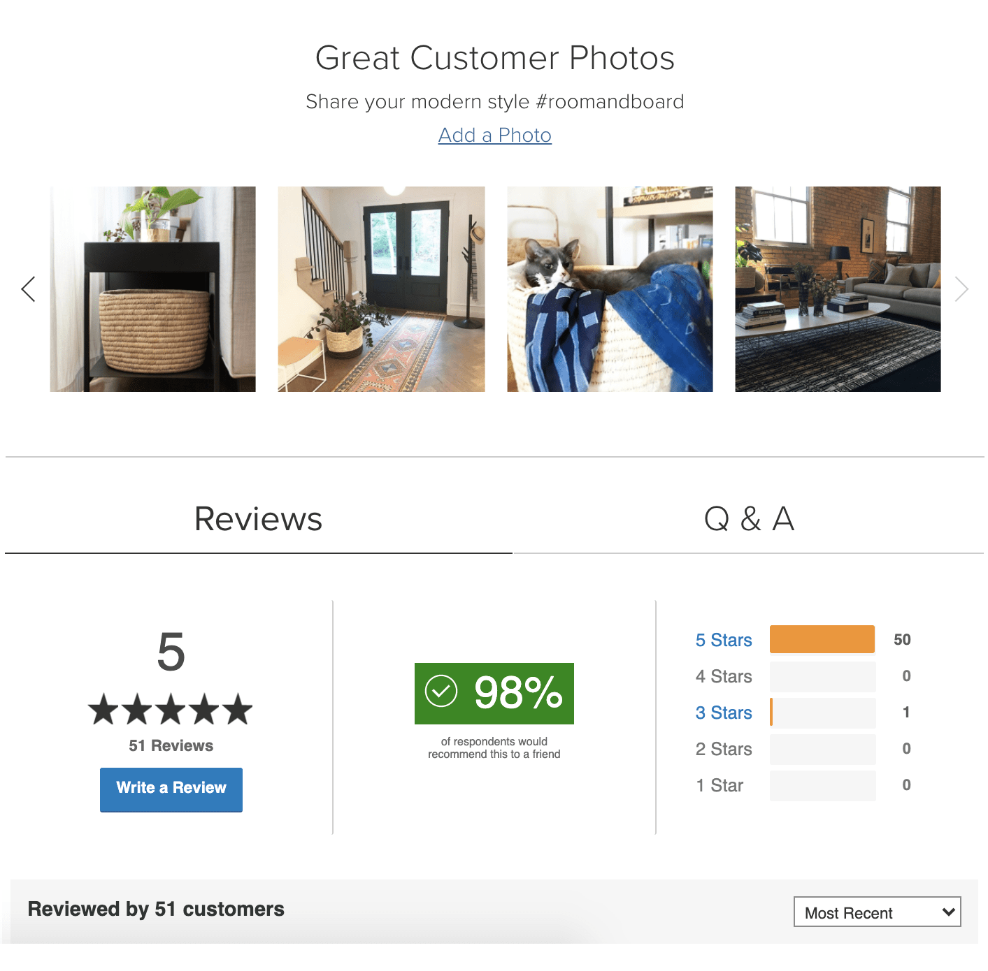 It’s important to display user-generated images in very prominent places. You can collect this content natively. We also recommend pulling in content from Instagram because the content quality is usually higher than what people add to a native review form where no one else sees it. People view their Instagram accounts like a personal brand, so the images they upload are carefully curated — and more likely to align with your brand standards.