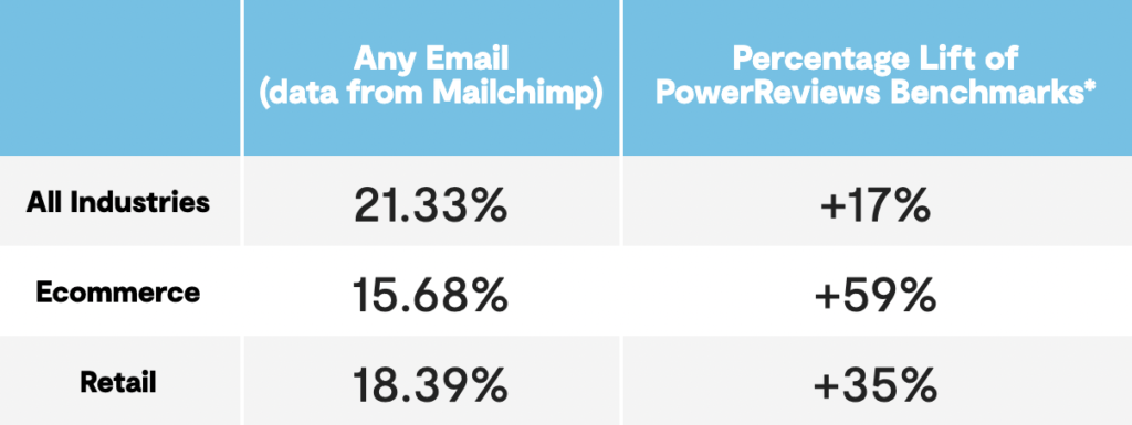 - PowerReviews review request emails have an average open rate 59% higher than ecommerce benchmarks.