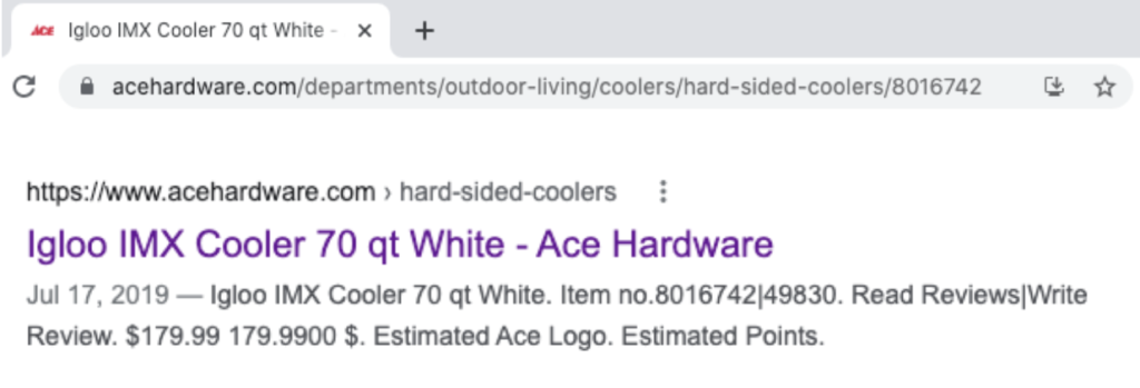 When you have a clear URL structure like this, Google will often display breadcrumbs with your search result. In the Ace Hardware example, that’s the “hard-sided-coolers” above the title tag. That breadcrumb information confirms to potential customers that they a) have the type of cooler they’re looking for and b) have enough of a selection for it to warrant its own category. That’s the kind of information that encourages more clicks and better SEO!