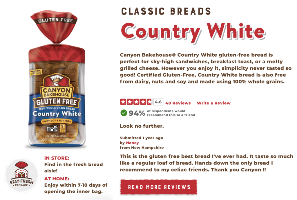 In their product description, Canyon Bakehouse makes sure to include important keywords a person on a gluten-free diet may be looking for, like “certified gluten-free” and “100% whole grains,” or a bread they can use to make “toast” or “sandwiches.”