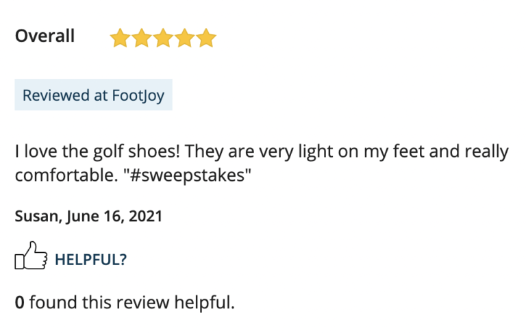 With PowerReviews, you can even tag your syndicated reviews. For example, this review at Zappos originally came via a sweepstakes on the FootJoy website: