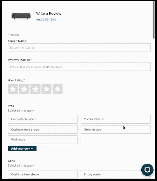 This very smartly plants ideas in the reviewer’s head that they will take into their comment submission later in the form. So “love this couch” becomes “I needed a modern looking couch that is super comfortable (mainly for watching TV) to be the centerpiece in my one-bedroom New York City apartment. I love how flexible it is…it’s equally great for lounging and as a formal piece for hosting” etc.