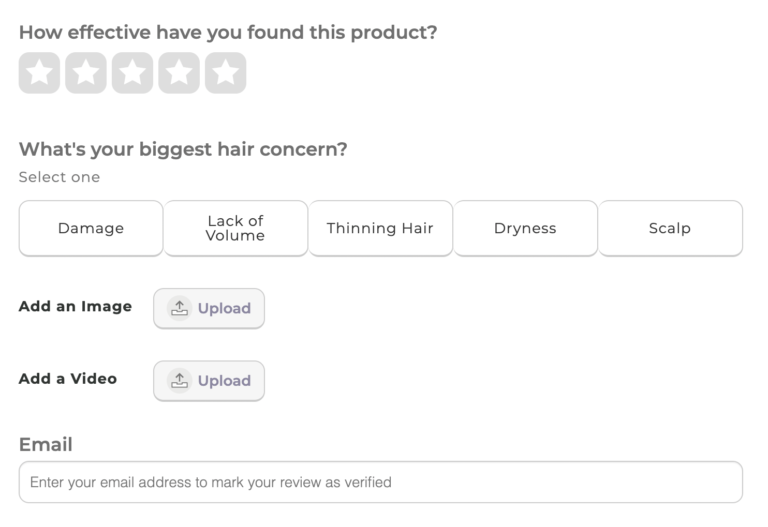 If you are a brand that sells different categories of products, you should definitely consider structuring your review collection form in line with this. In the below example, the brand has different forms for its skincare and hair care products. This makes total sense: buyers have completely different concerns when shopping for these items.