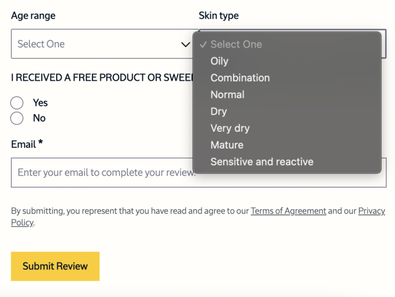 For example, a skincare company might opt to include questions about the reviewer’s skin type and skin concerns. That way, the brand can add a feature to their display allowing shoppers to easily find content written by others with similar skin types and concerns.